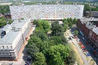W okresie PRL-u częściowo zniweczono te staranne działania tworzenia uporządkowanej i zrównoważonej tkanki miejskiej realizując drastycznie przeskalowany wieżowiec łamiący dalekie pole widokowe wieży kościelnej i separujący dzisiejszy plac Jana Pawła II od naturalnie skomunikowanego z nim parku. Ponadto po raz kolejny świadomie lub nieświadomie umniejszono rangę kościoła i jego przedpola doprowadzając do zadrzewienia placu Jana Pawła II . Nie kontynuowano planowanej zabudowy na wschód od kościoła wprowadzając funkcję ogrodów działkowych oraz stanowisk garażowych. Zamiast zabudowy kwartałowej wykonano socrealistyczne bloki.